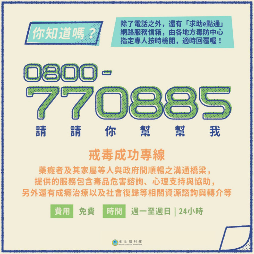 ☎️0800-770885 毒品危害防制中心諮詢專線☎️