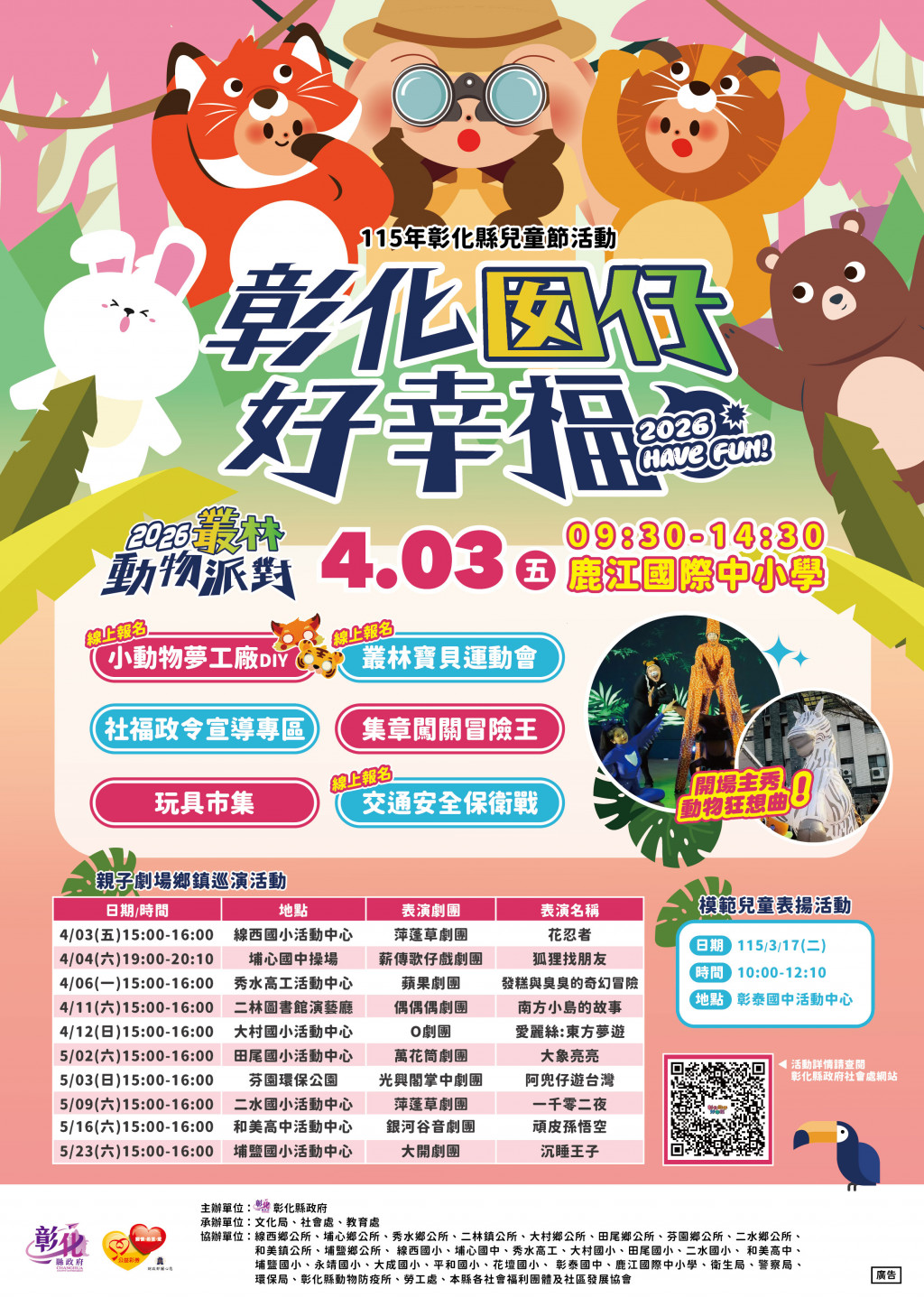 | 三、 | 活動訊息請至本府社會處網站/活動訊息專區/彰化囡仔好幸福~115年彰化縣兒童節活動「2026叢林動物派對」(網址:https://reurl.cc/ZZRY8a)參閱。 |
